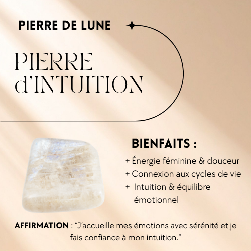 🌙 Pierre de lune – Intuition & féminin sacré, douce connexion au cœur.
